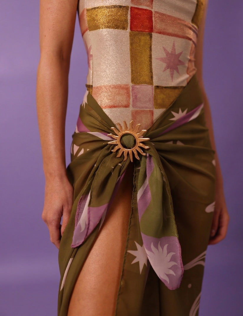 El Pareo Largo Eclipse Verde es la pieza versátil que necesitas para complementar tu look playero con un toque natural y editorial. Este pareo transforma tu vestido de baño en múltiples looks mientras te mantiene cómoda bajo el sol.