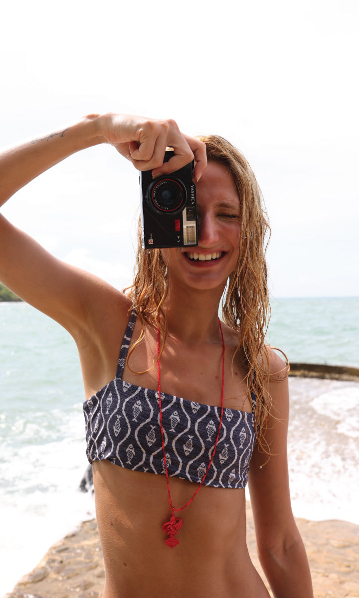 Azul estampado brilla especialmente cuando lo usas en un top pensado para paseos y momentos felices en tus vestidos de baño.