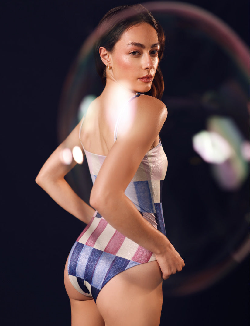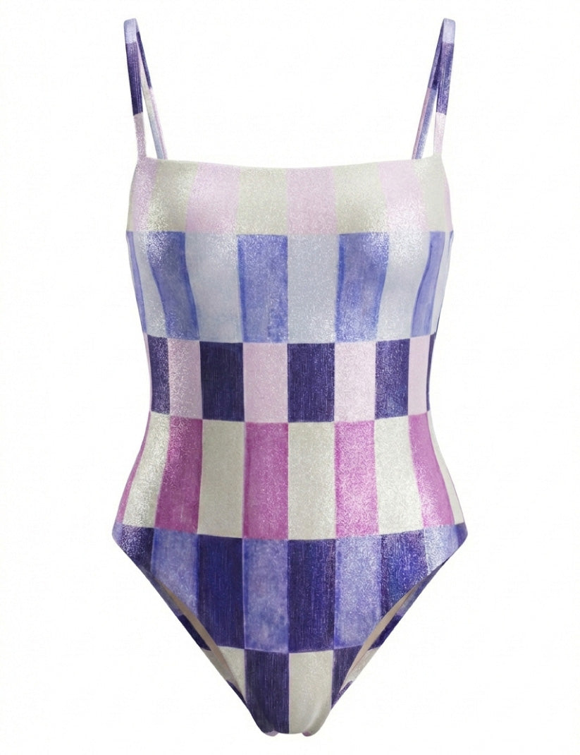El Enterizo Boreal tiene un estampado de cuadros en una paleta de colores inspirada en la aurora boreal: tonos que van del azul al verde y al lila, todos en una sola pieza.